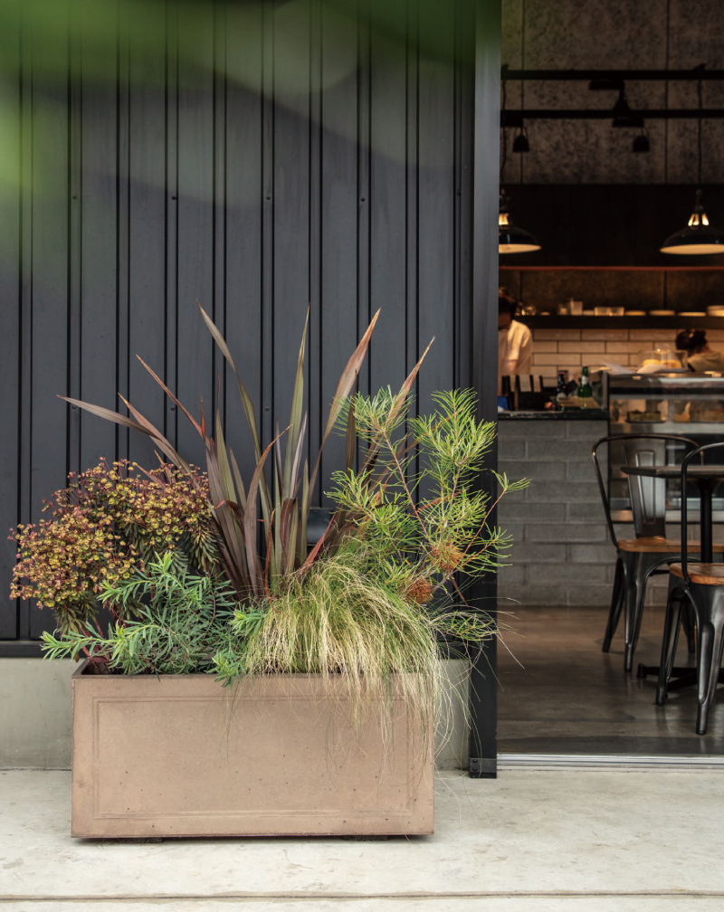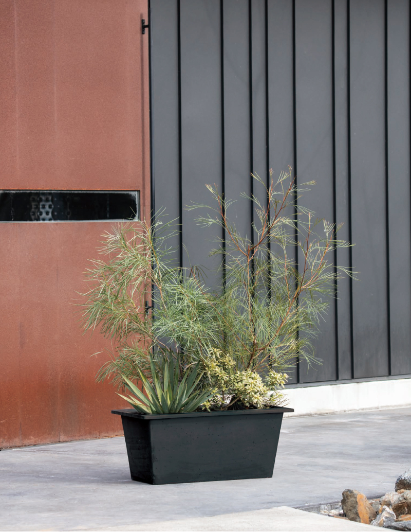 段差をつけた意匠によって引き締まった印象の角形デザインプランター。